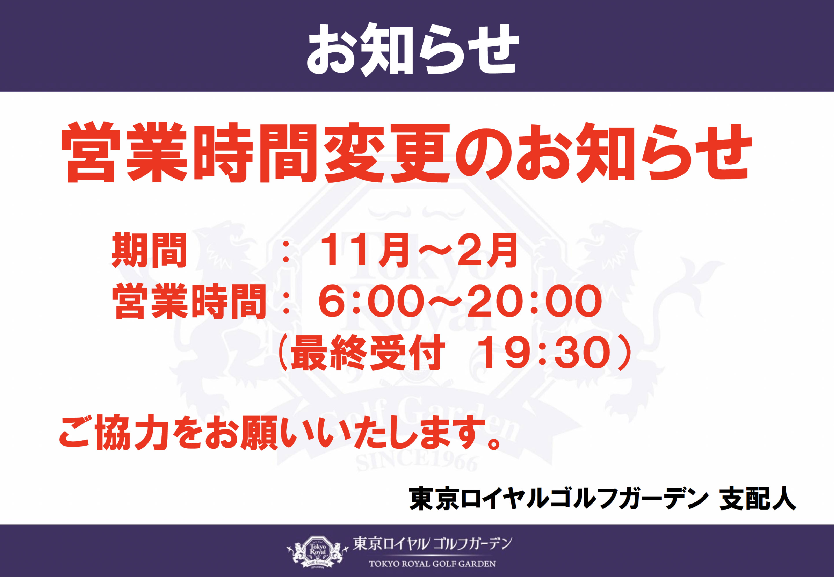 11月1日より冬季営業時間となります