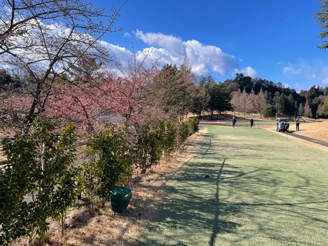 コース脇で河津桜が咲き始め、冬のゴルフにやさしい彩りを添えています。