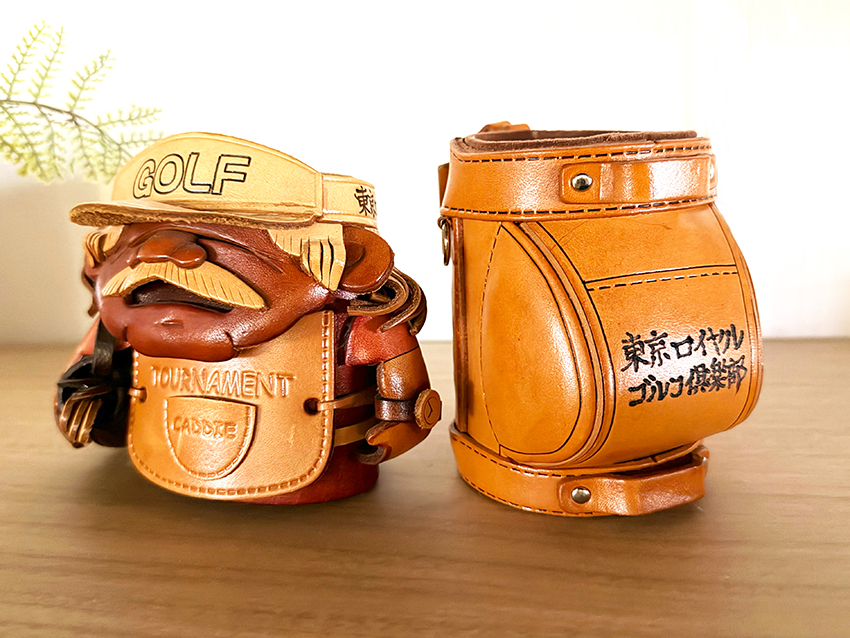 こちらのロゴ入り小物スタンドはゴルファーモチーフとゴルフバッグの2種ご用意。